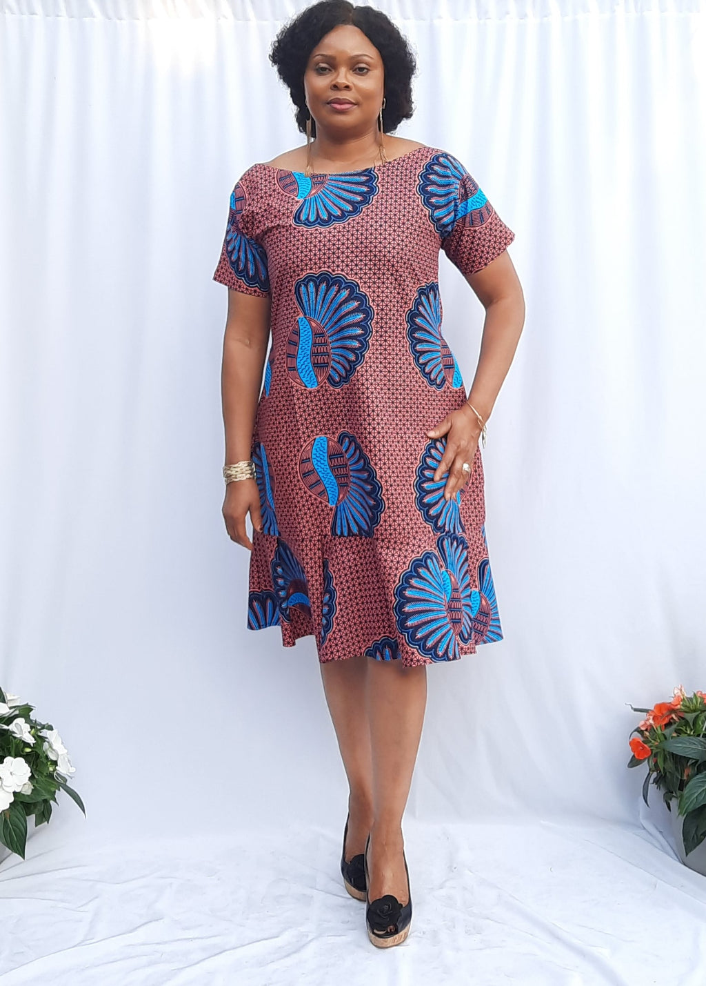 Stylish African Print Knee Length Ballerina Neckline Loose Dress--Short Sleeve with Pockets..