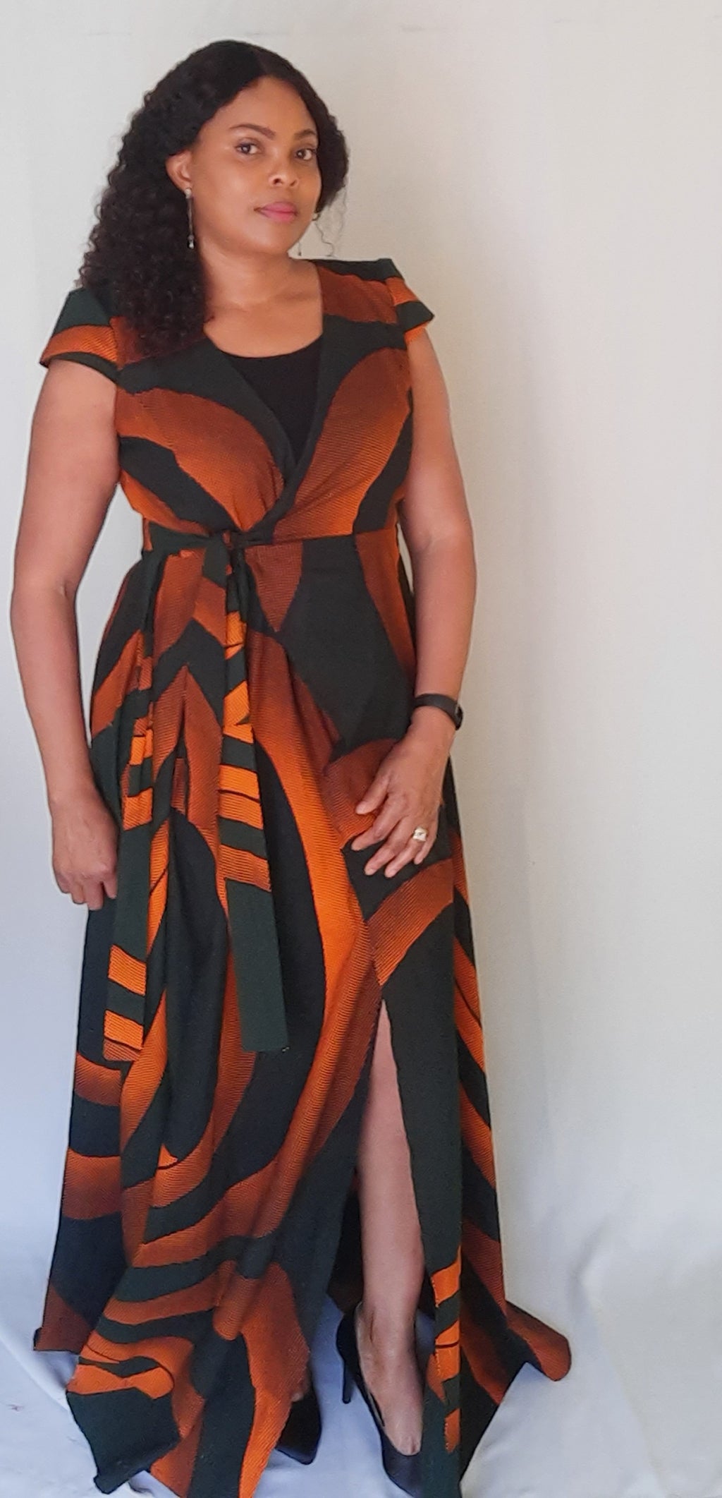 Elegant African Print V-Neck Bottom Slit Wrap Dress, with Belt.